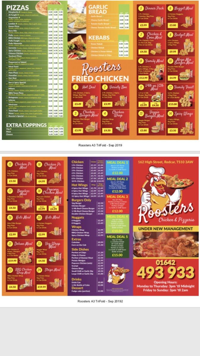 For families, the kids’ menu is thoughtful, featuring items such as Kids Parmo And Chips and Kids Pitta Bread With Garlic, ensuring younger diners are well catered for. Drink selections, including Coke Zero, Fanta Can, and Dr Pepper Can, complement the meals, while meal deals like Home Alone Deal 1 and Meal Deal 5 provide value-packed options for those seeking a complete feast. Overall, the menu at Roosters Pizzeria And Pamasan House is versatile, generous, and straightforward, making it a dependable choice whether you’re after a quick bite, a family meal, or a satisfying indulgence.